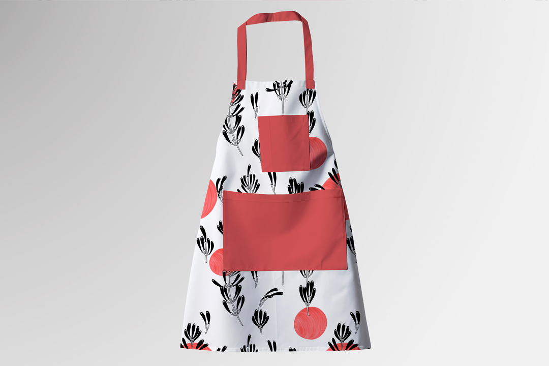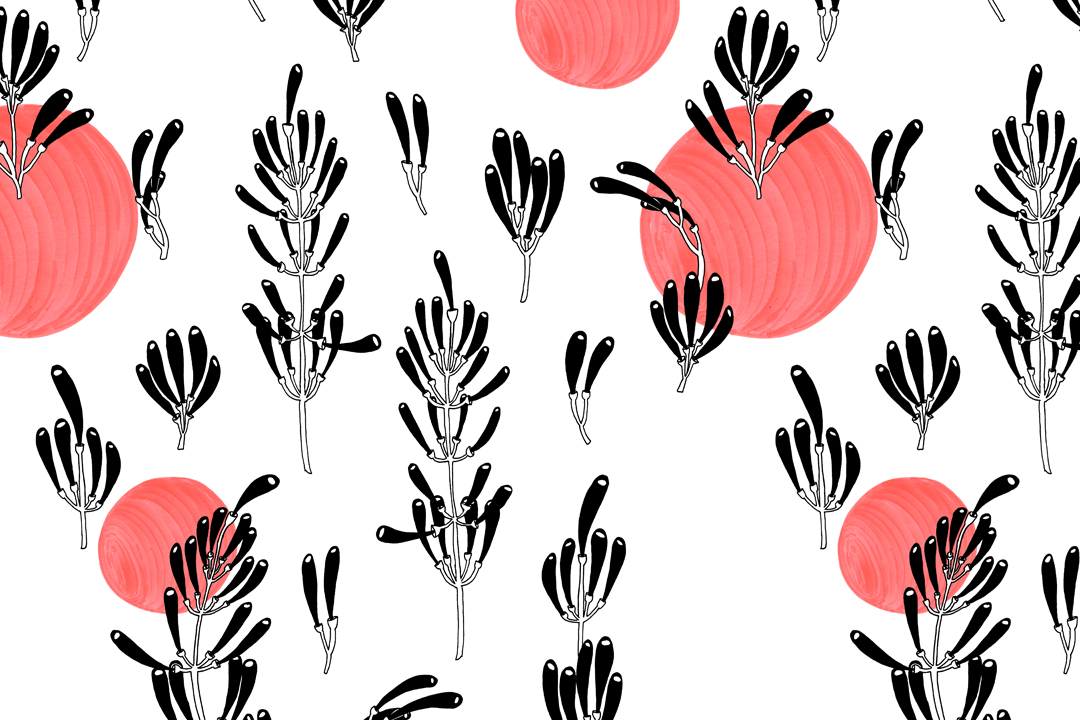Kompozycja zbudowana z jednokolorowych elementów roślinnych i czerwonych elementów. Wzór bezszwowy, wielokierunkowy.